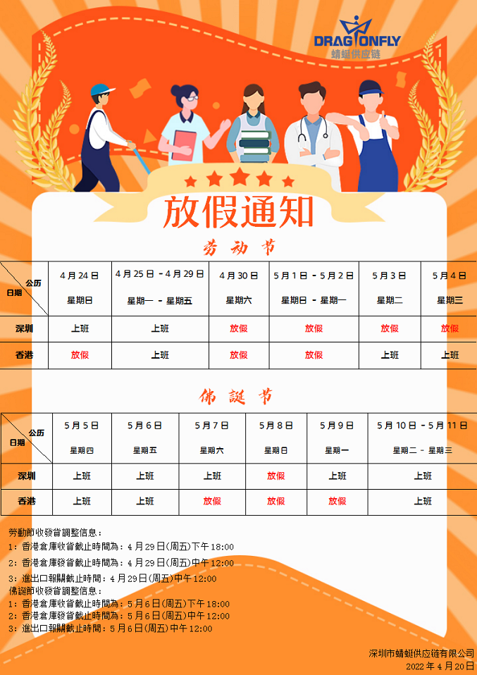 根据国家法定节假日规定,结合公司研究决定,关于2022年劳动节与佛诞节的放假时间安排如下: