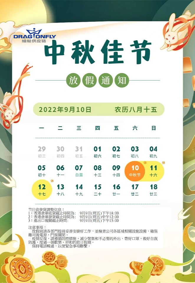 根据国家法定节假日规定,结合公司研究决定,我司2022年中秋节的放假时间如下: