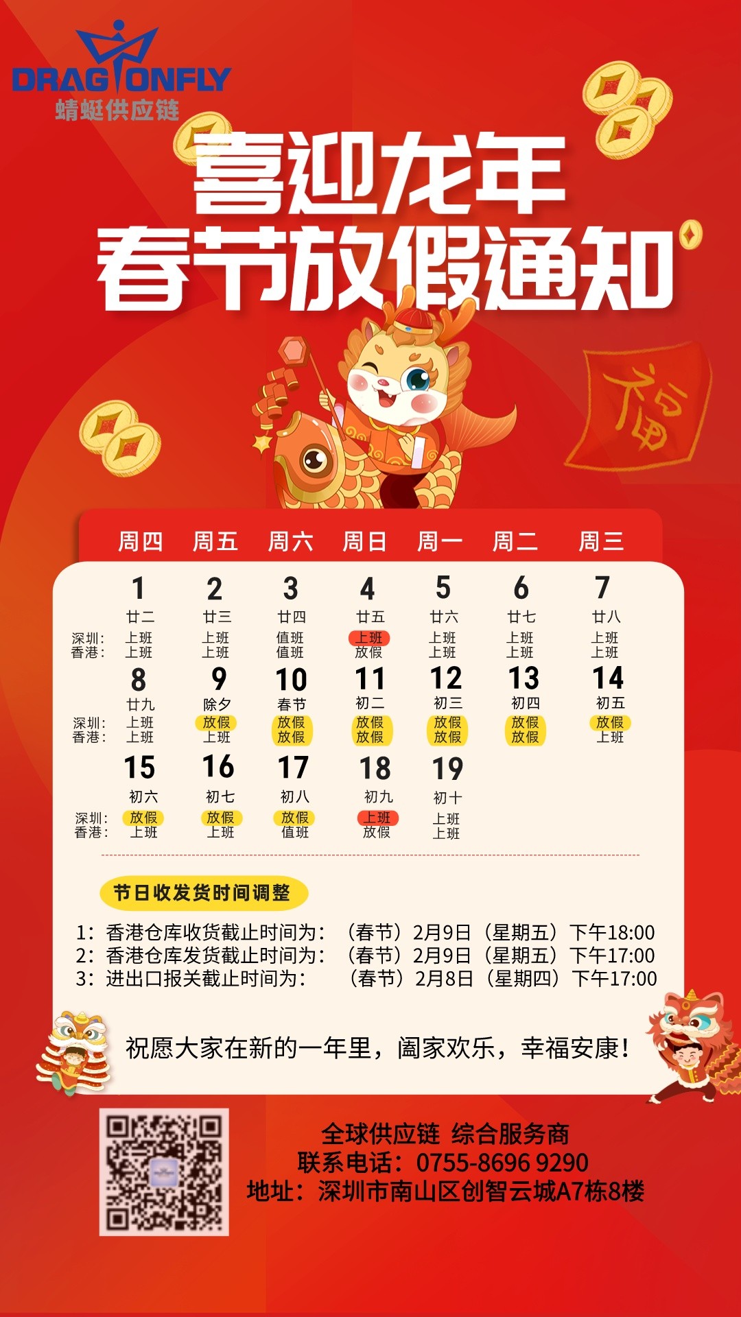 根据国家规定及公司实际情况,我司2024年春节放假安排如下,请各位顾客提前安排好采购、供货、付款计划:
